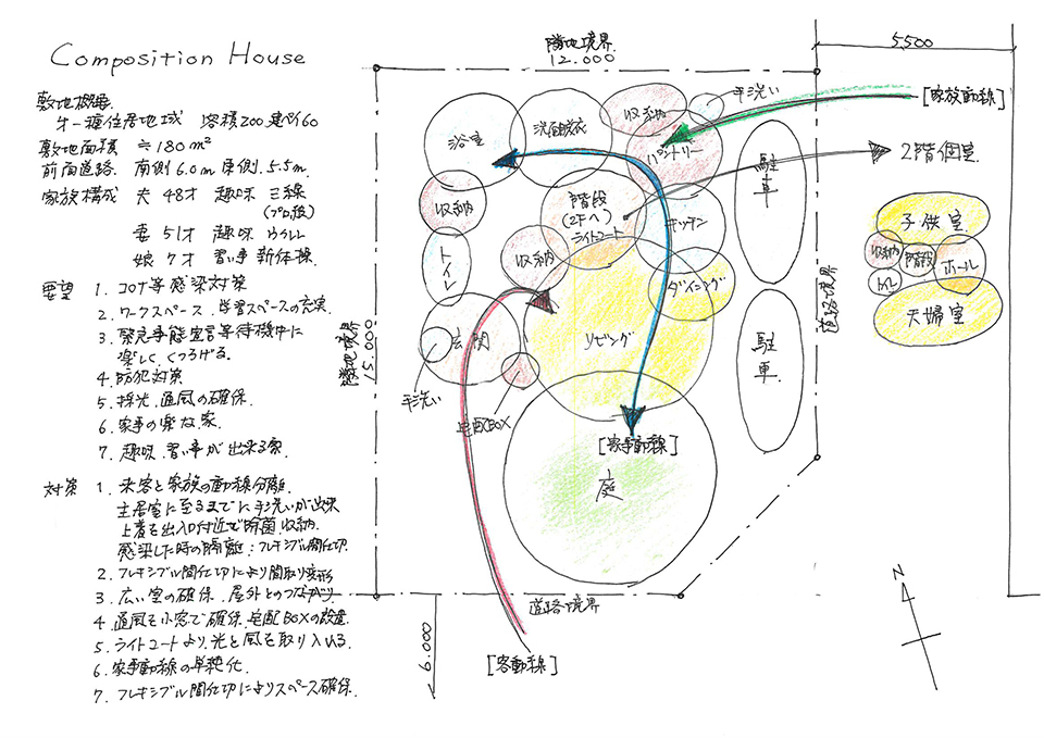 家族とゲストの動線を分離し、それぞれに手洗い・消毒場所を確保。